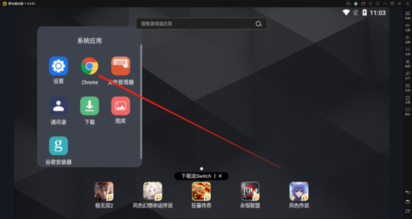 三、安装好后模拟器后,我们找到系统应用那个文件夹,找到Chrome浏览器,把游戏下载地址(qnss39.com)复制到浏览器搜索,找到你想玩的游戏下载就可以了。